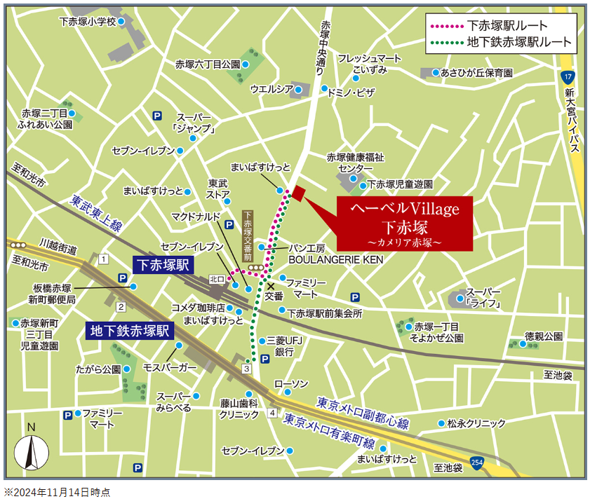 ヘーベルVillage 下赤塚~カメリア赤塚~は、東武東上線「下赤塚」駅徒歩3分、地下鉄有楽町線・副都心線「地下鉄赤塚」駅徒歩5分の好アクセスで、池袋駅へ14分・渋谷駅へ直通30分など都心への移動も快適。