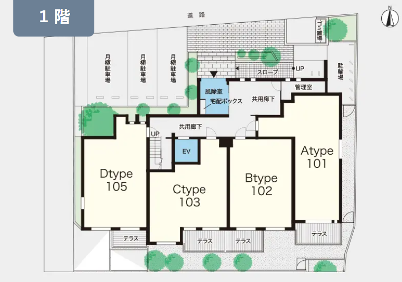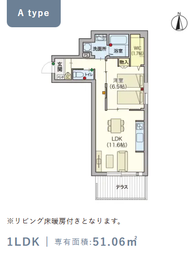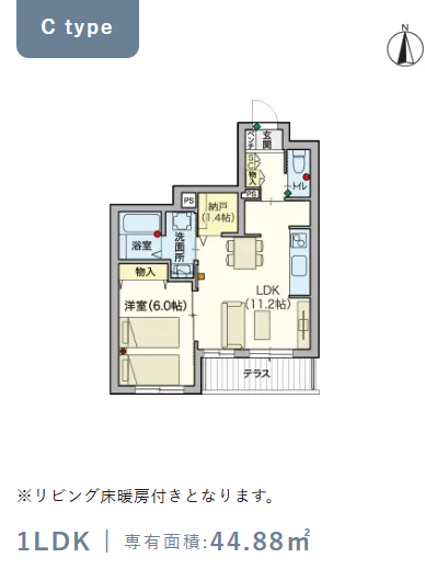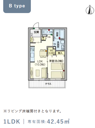 全15戸、間取りは1LDK~2LDK(専有面積約42.5~60.3㎡)で、ゆとりある住空間。ZEH-M対応による断熱・省エネ設計で、快適かつ経済的に暮らせます。