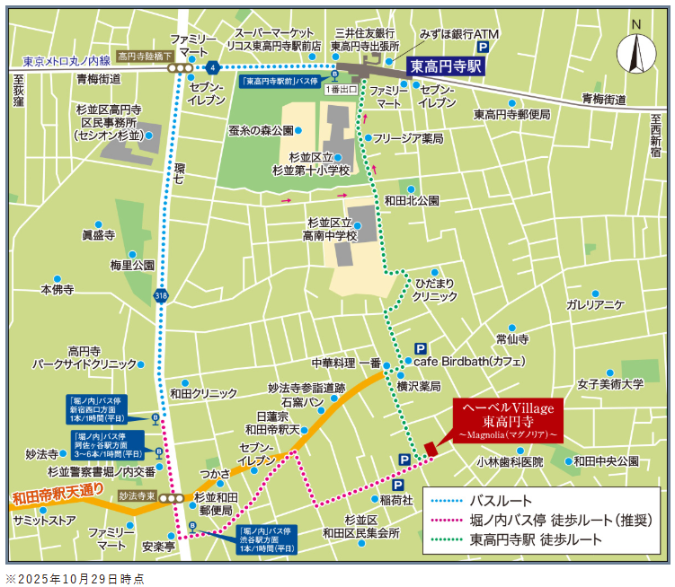 「堀ノ内」新宿西口方面バス停[徒歩6分]、「東高円寺駅前」バス停[乗車5分]または、東京メトロ丸ノ内線「東高円寺」駅[徒歩9分]
