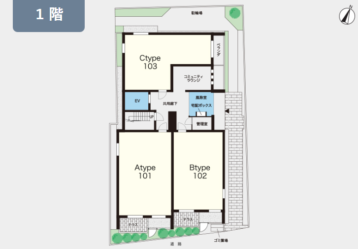 オートロック・共用エレベーター・共用コミュニティースペース・AED |