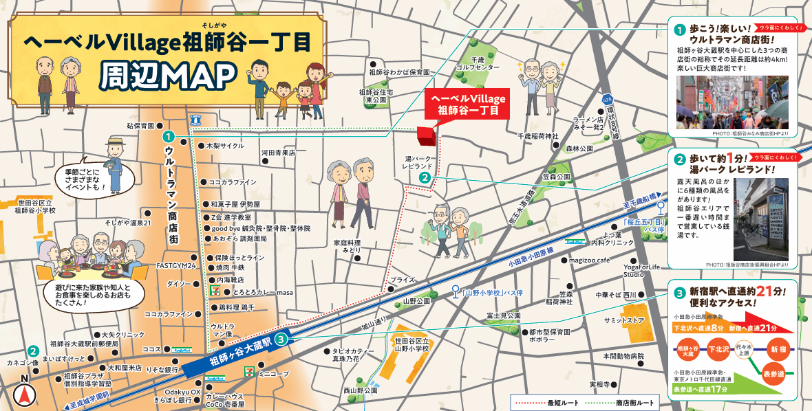 「ヘーベルVillage祖師谷一丁目」のある「祖師ヶ谷大蔵」駅は小田急小田原線が通っており「下北沢」駅まで8分、「新宿」駅まで21分と都心へも近く利便性に優れた街です。「祖師ヶ谷大蔵」駅周辺には、駅を挟んで南北に「ウルトラマン商店街」がのびており、お店が豊富にあり、人とのふれあいを大切にしている地域に密着した商店街です。他にも銭湯や公園など快適な暮らしをつくる環境が充実しています。また、物件周辺は治安の良い街としても知られ、安心して生活をおくることができます。